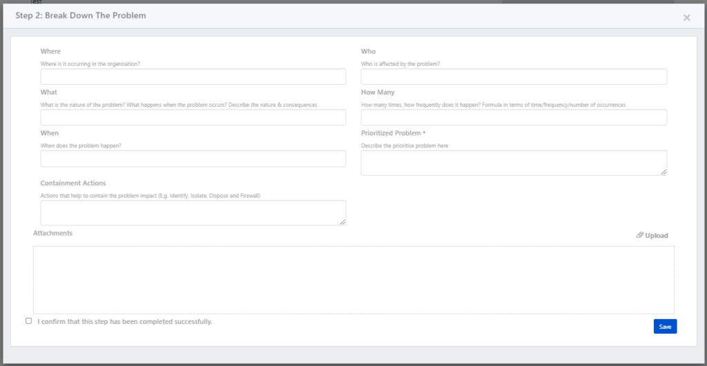To complete the Step 2 enter all the Break Down Problem details and confirm that the step is completed. Prioritized Problem is mandatory to describe before completing the Step 2.